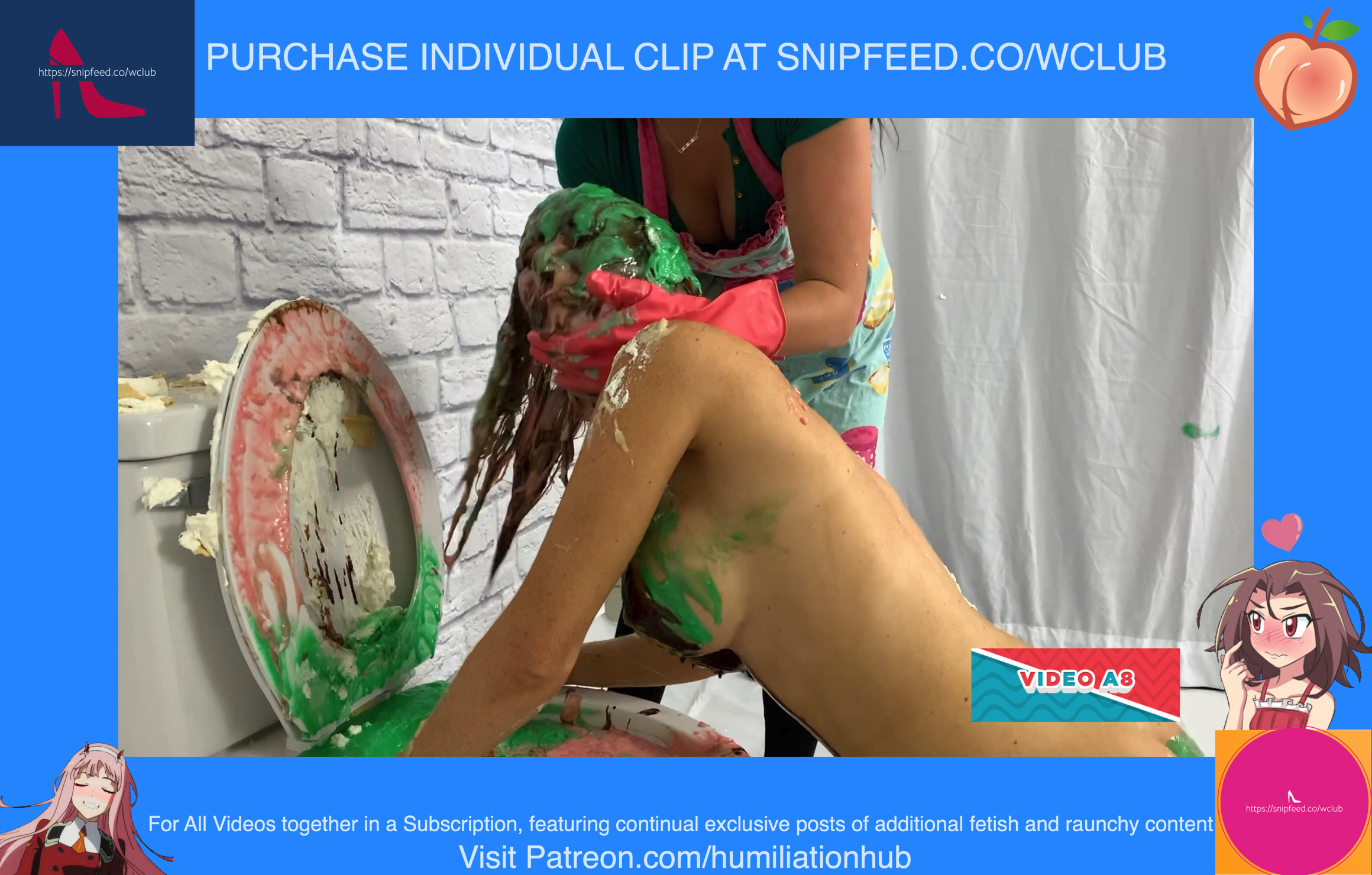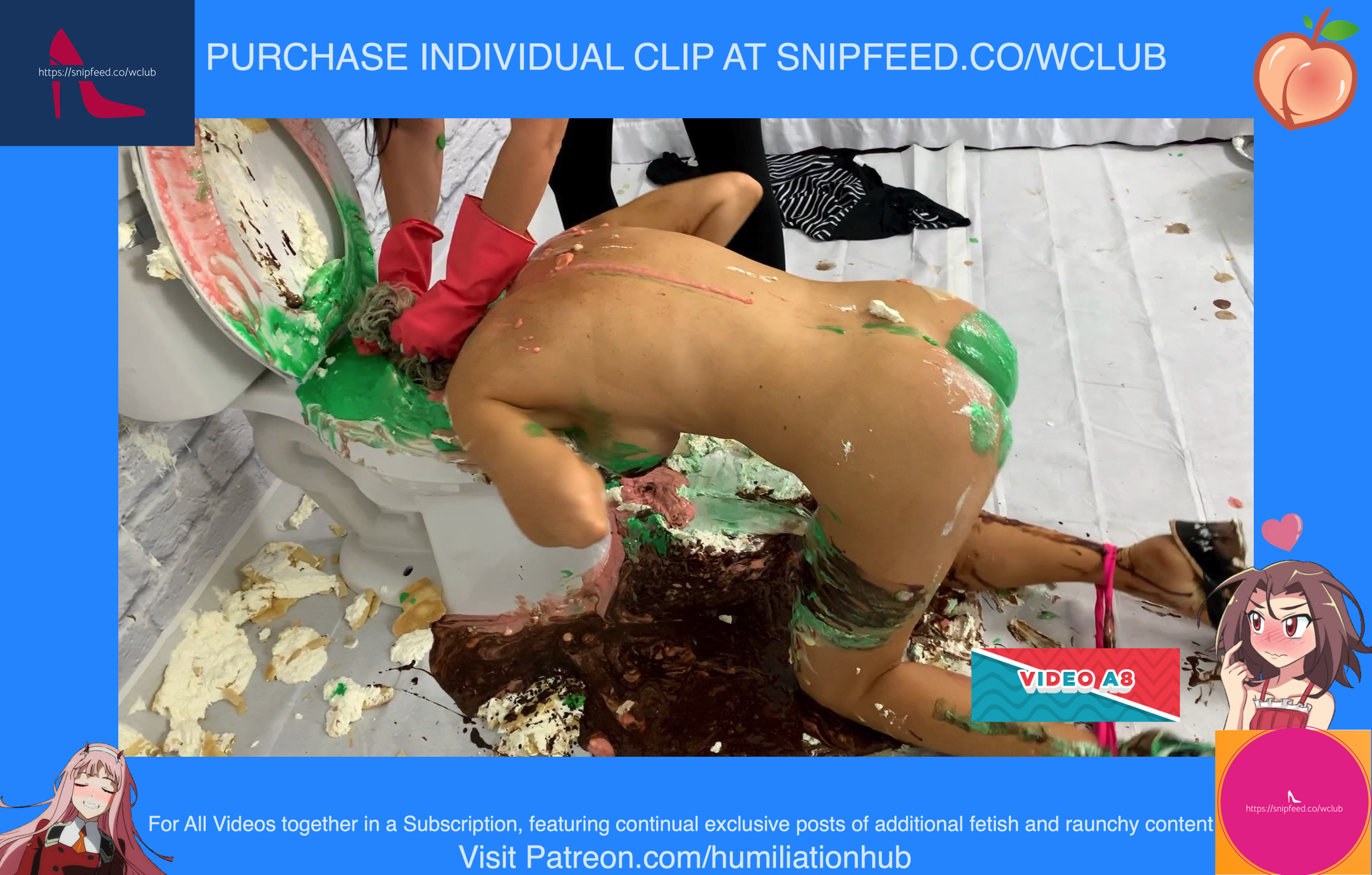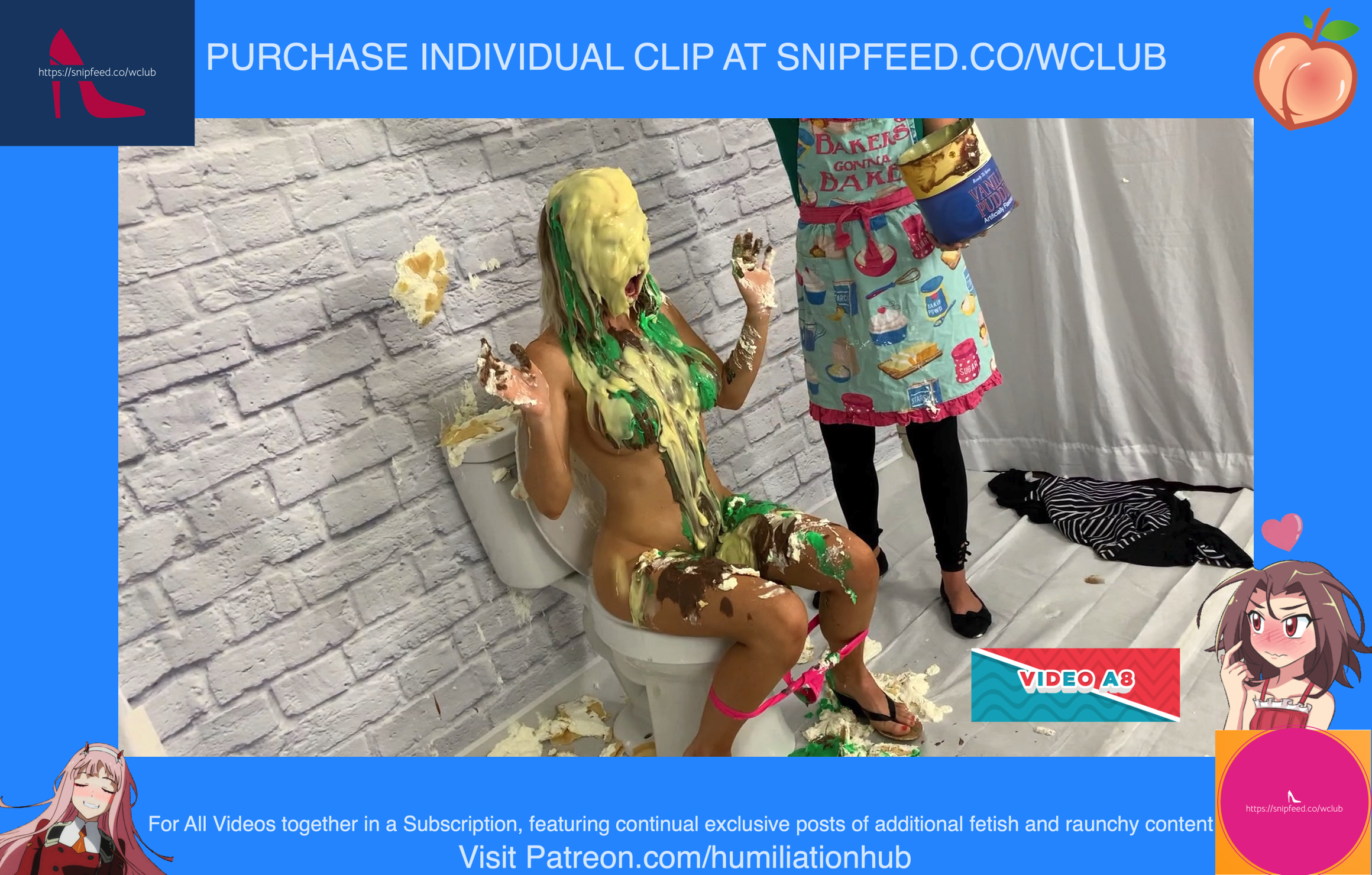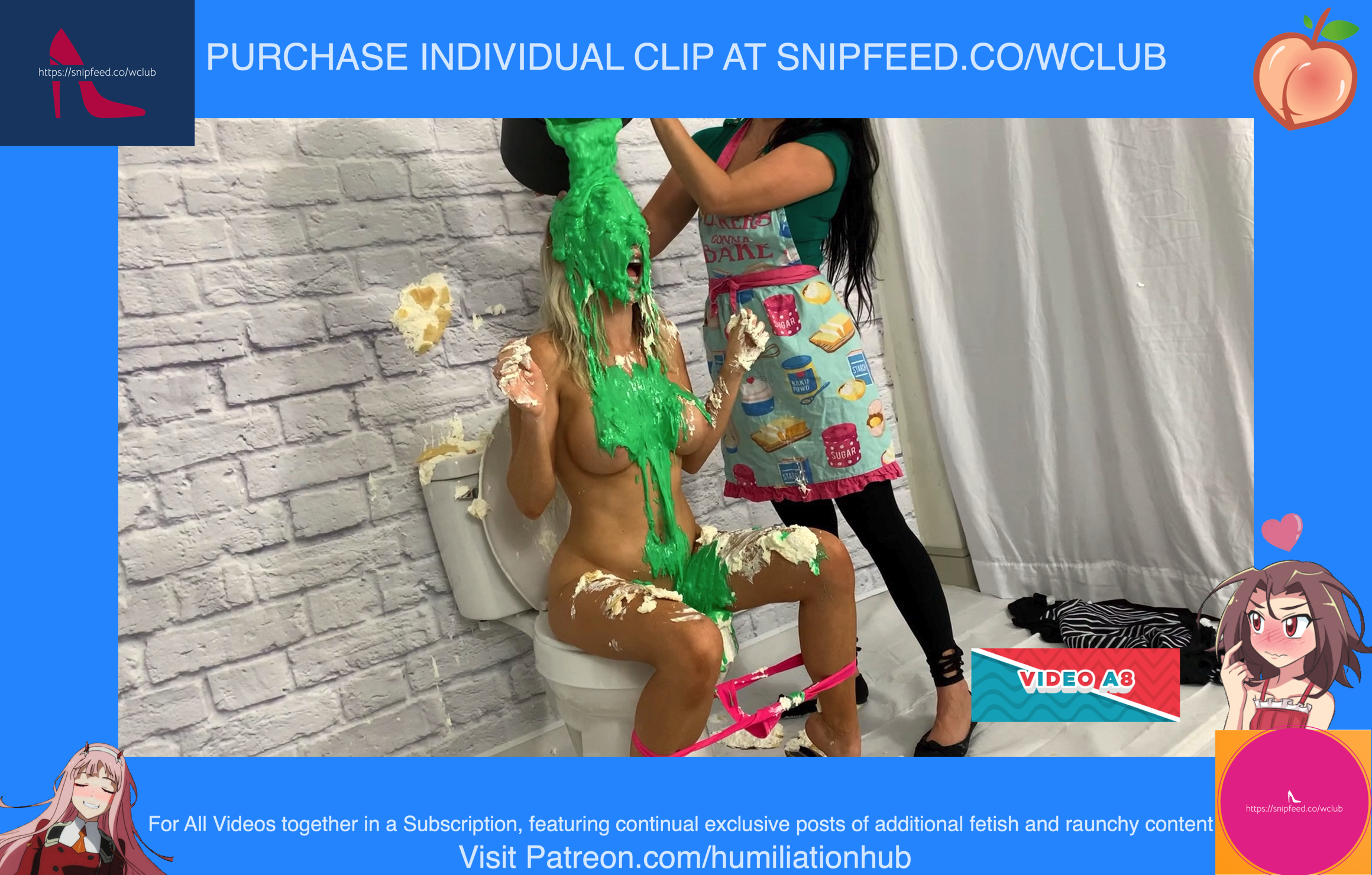 In the Restroom Scene, Layla tells Raven that she’ll follow her advice, sarcastically, and flush the desserts down the toilet. Unfortunately for Raven, that means she’ll get the brunt of the punishment. Raven's dress is torn off and she’s pied hard in the face to her surprise. Next comes a sloppy batter pour all over Raven, in addiction to pudding and chocolate syrup for an added touch. Layla tells Raven that the toilet looks like it’s backed up and she needs her help finding the clog. She pulls Raven’s hair by the hair and then shoves her head into the slop-filled toilet. She even uses the plunger on her back to get her head deep in. Now Raven is sitting on the toilet senseless and stupefied, but even worse she’s a total mess now as well with the plunger stuck on her head. Layla finally finishes her off by pouring a sloppy mix over her head.Epic messy humiliation!