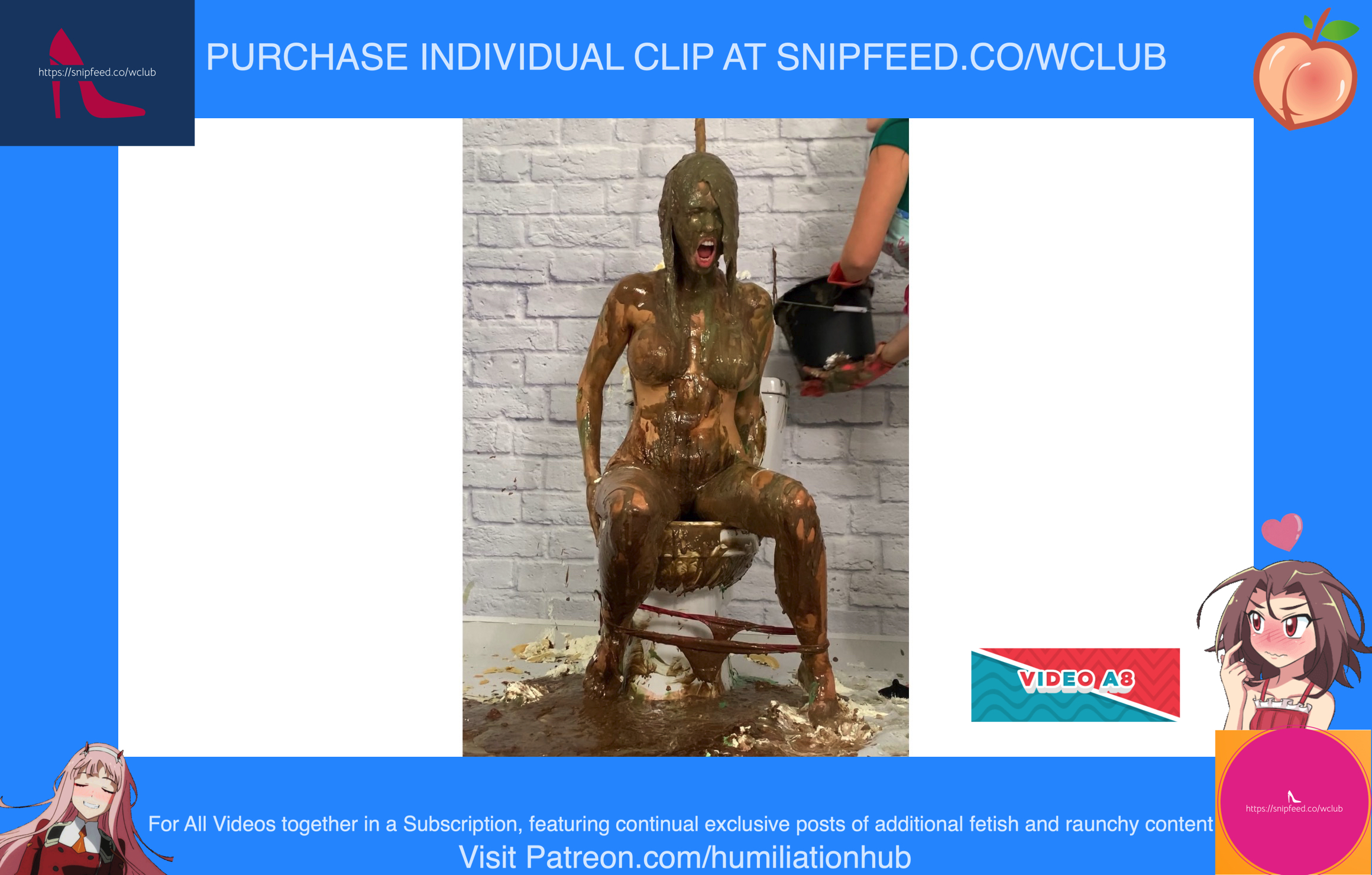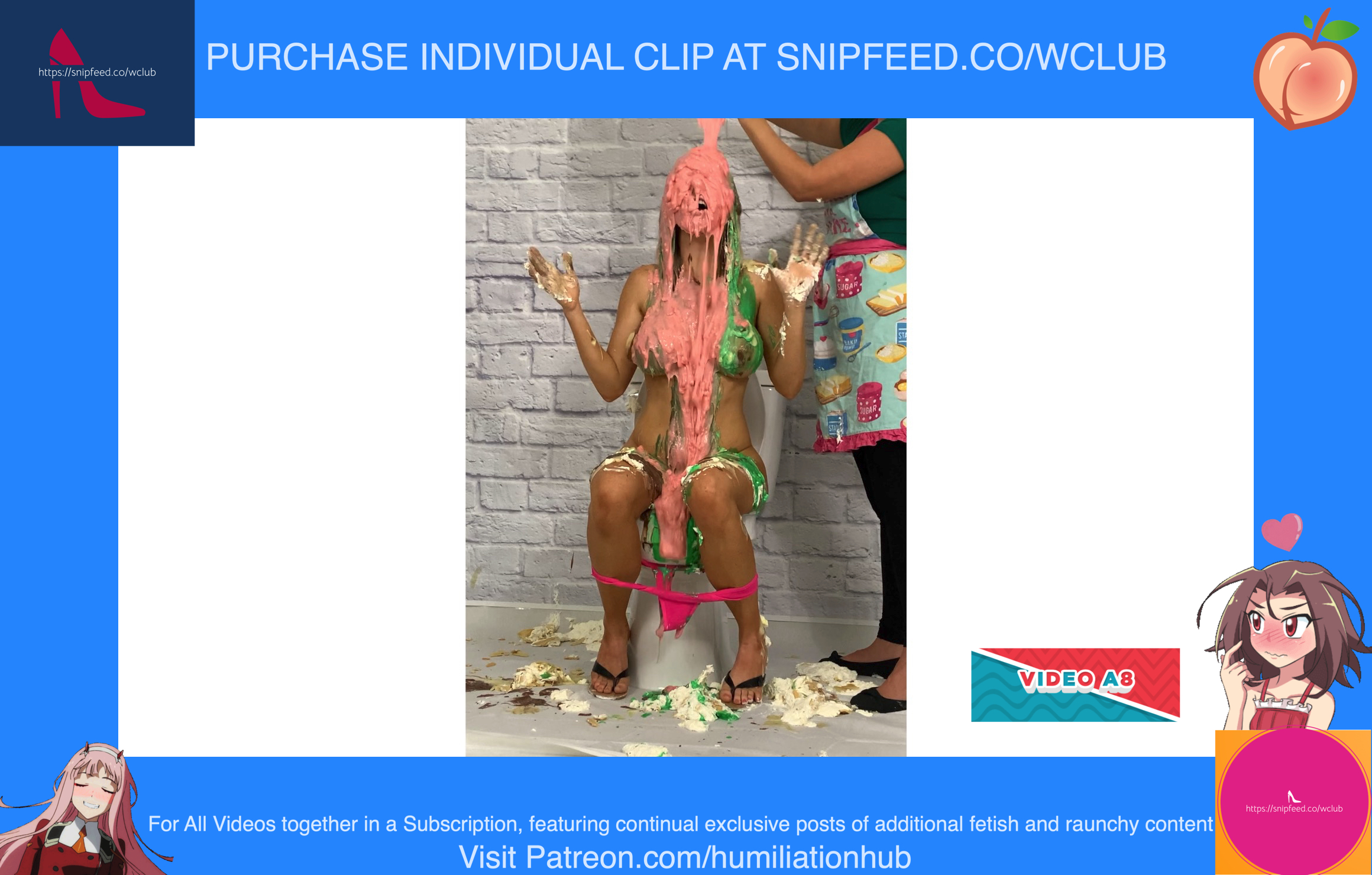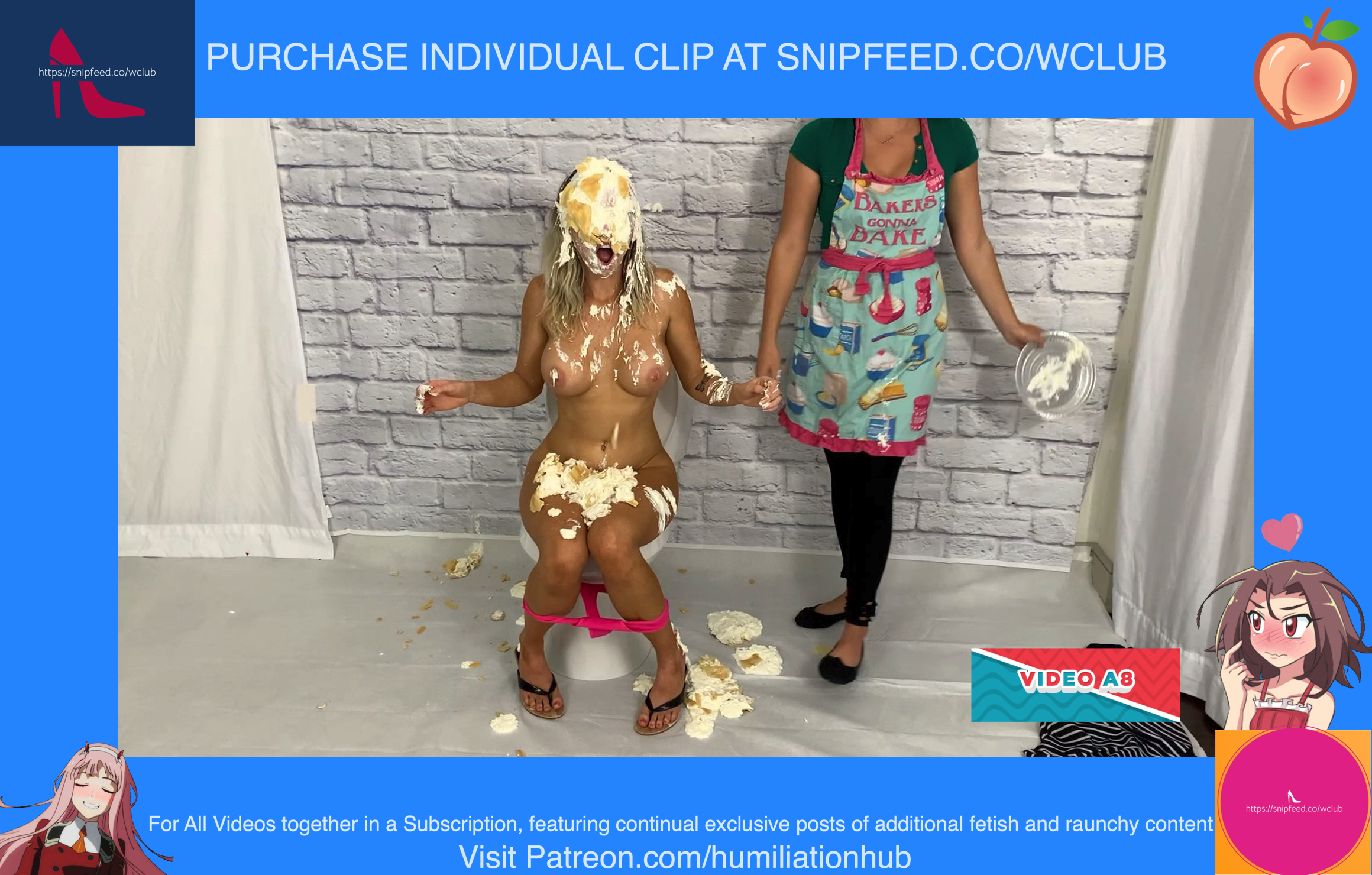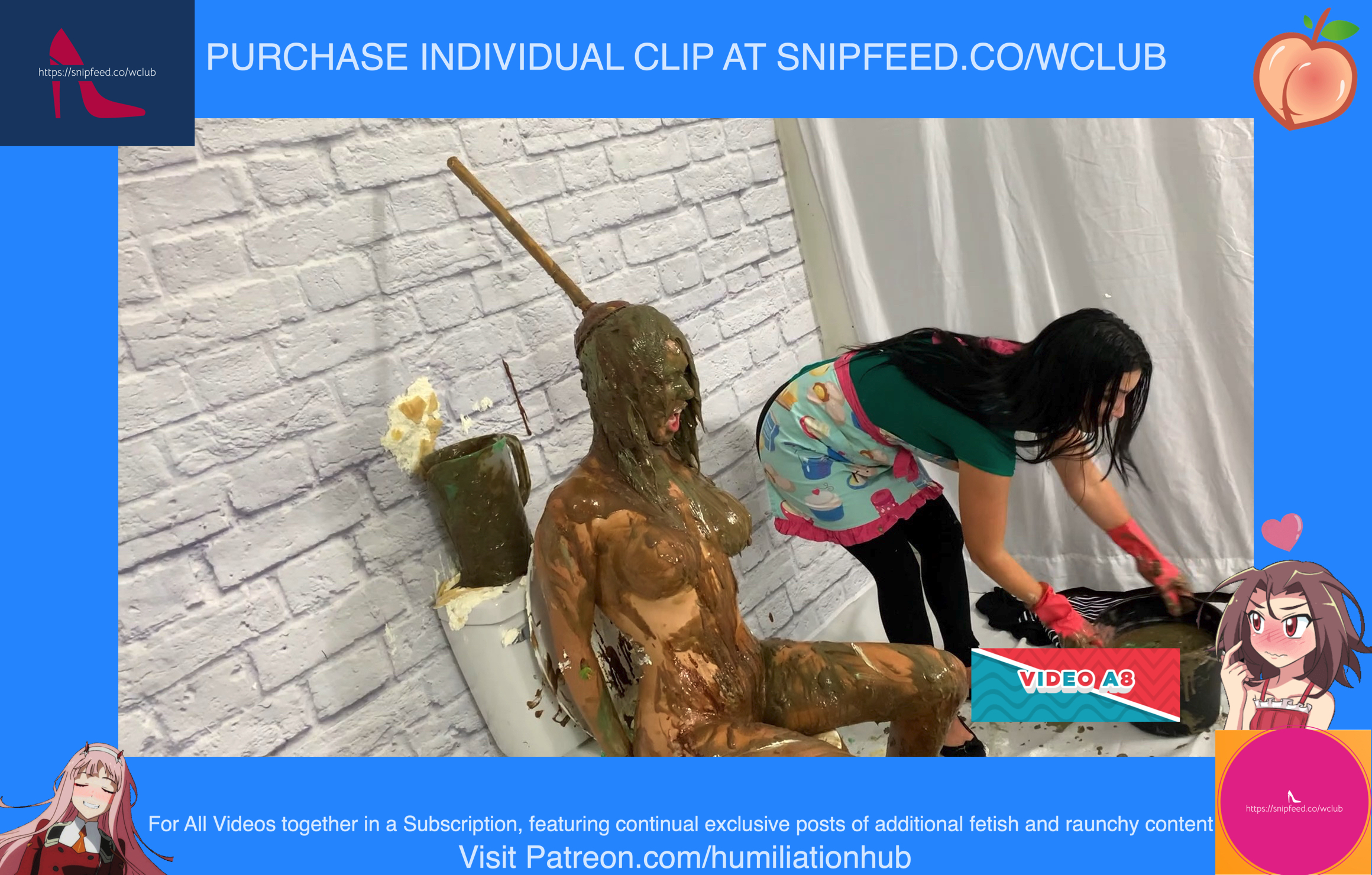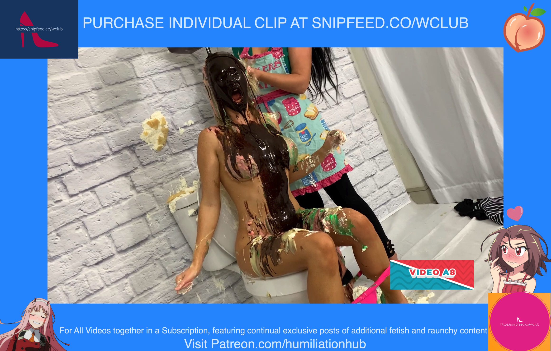 In the Restroom Scene, Layla tells Raven that she’ll follow her advice, sarcastically, and flush the desserts down the toilet. Unfortunately for Raven, that means she’ll get the brunt of the punishment. Raven's dress is torn off and she’s pied hard in the face to her surprise. Next comes a sloppy batter pour all over Raven, in addiction to pudding and chocolate syrup for an added touch. Layla tells Raven that the toilet looks like it’s backed up and she needs her help finding the clog. She pulls Raven’s hair by the hair and then shoves her head into the slop-filled toilet. She even uses the plunger on her back to get her head deep in. Now Raven is sitting on the toilet senseless and stupefied, but even worse she’s a total mess now as well with the plunger stuck on her head. Layla finally finishes her off by pouring a sloppy mix over her head.Epic messy humiliation!