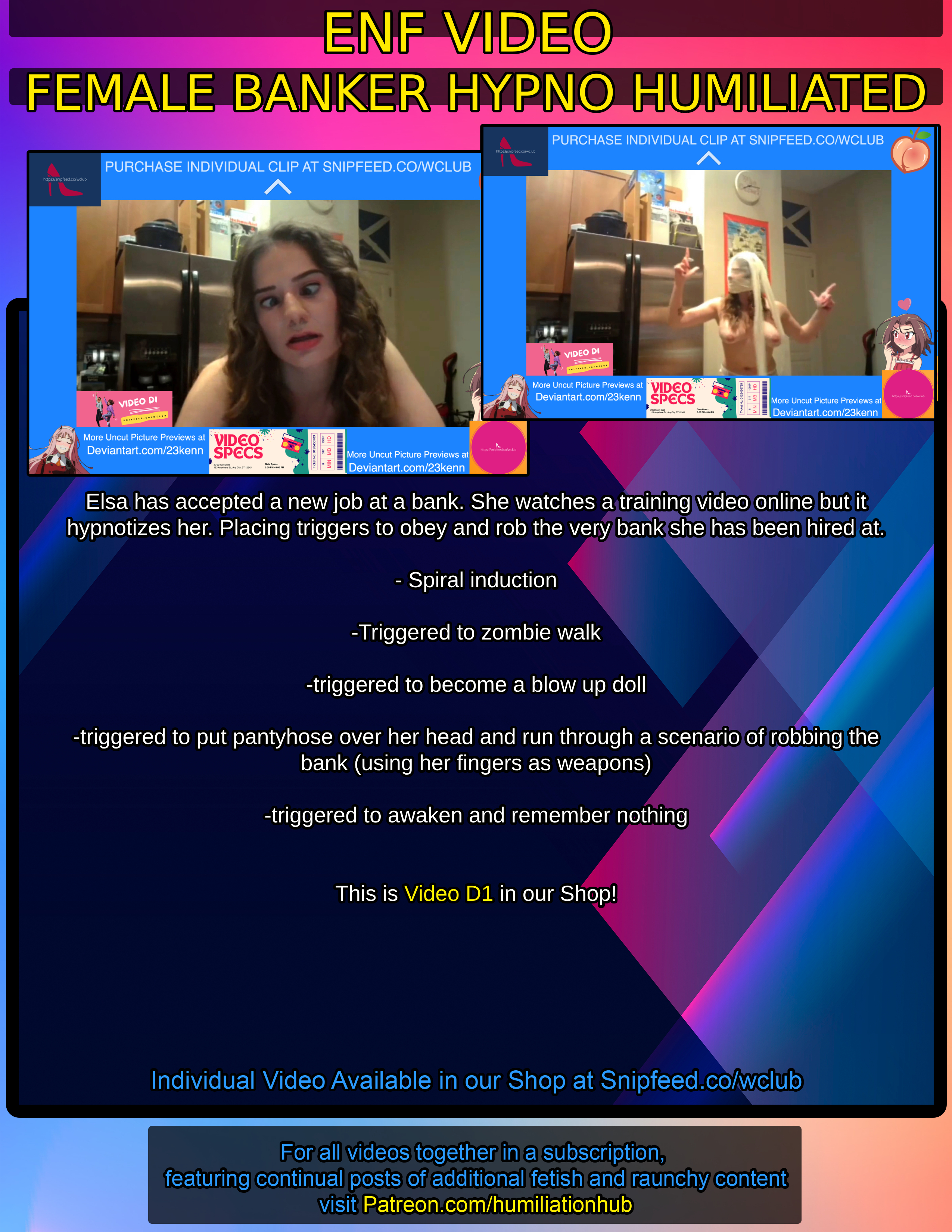 Description: Custom Video: Elsa has accepted a new job at a bank. She watches a training video online but it hypnotizes her. Placing triggers to obey and rob the very bank she has been hired at. How humiliating and embarrassing for what's in store! - Spiral Induction - Triggered to zombie walk - Triggered to become a blow up doll - Triggered to put her own worn white pantyhose over her head and through a scenario of robbing the bank with her big breasts exposed and butt naked (using her fingers as weapons) - Triggered to awaken and remember nothing This is Video D1 in our Shop!