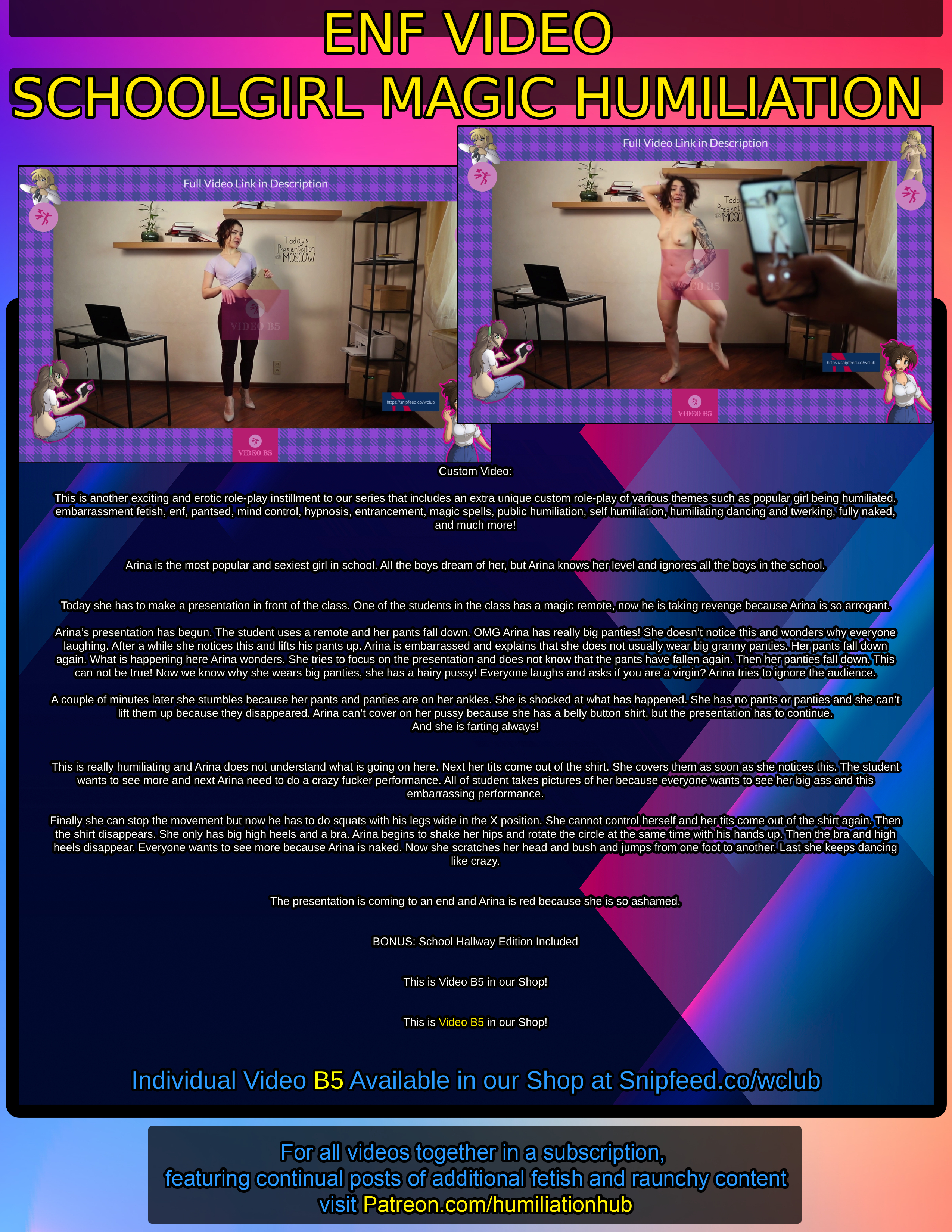 This is another exciting and erotic role-play instillment to our series that includes an extra unique custom role-play of various themes such as popular girl being humiliated, embarrassment fetish, enf, pantsed, mind control, hypnosis, entrancement, magic spells, public humiliation, self humiliation, humiliating dancing and twerking, fully naked, and much more!