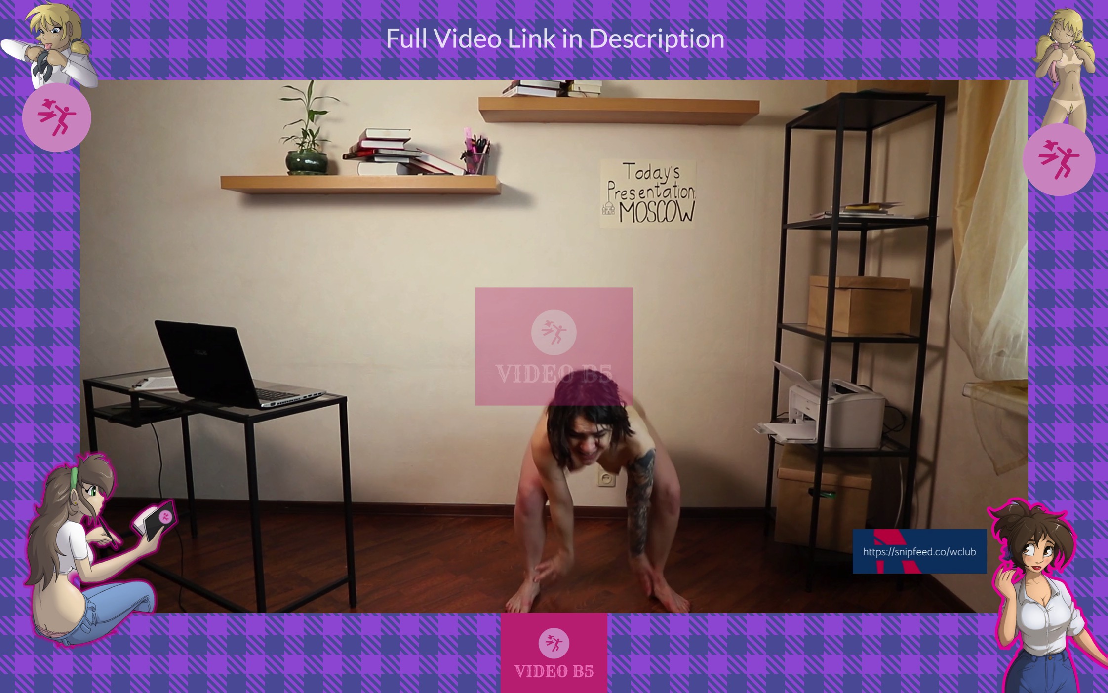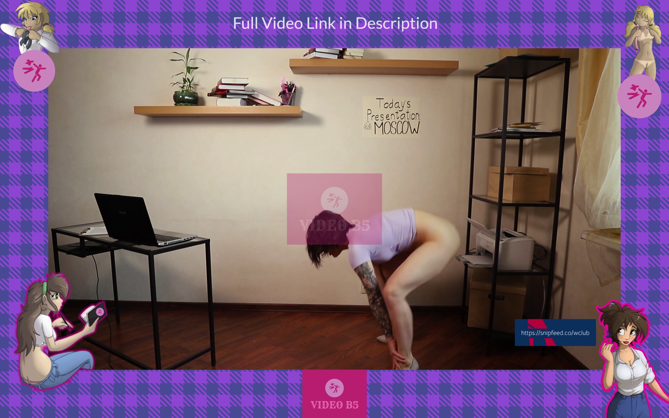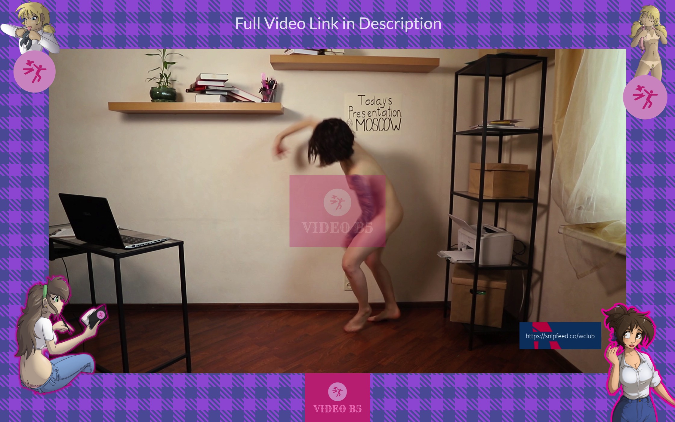 A couple of minutes later she stumbles because her pants and panties are on her ankles. She is shocked at what has happened. She has no pants or panties and she can’t lift them up because they disappeared. Arina can’t cover on her pussy because she has a belly button shirt, but the presentation has to continue.